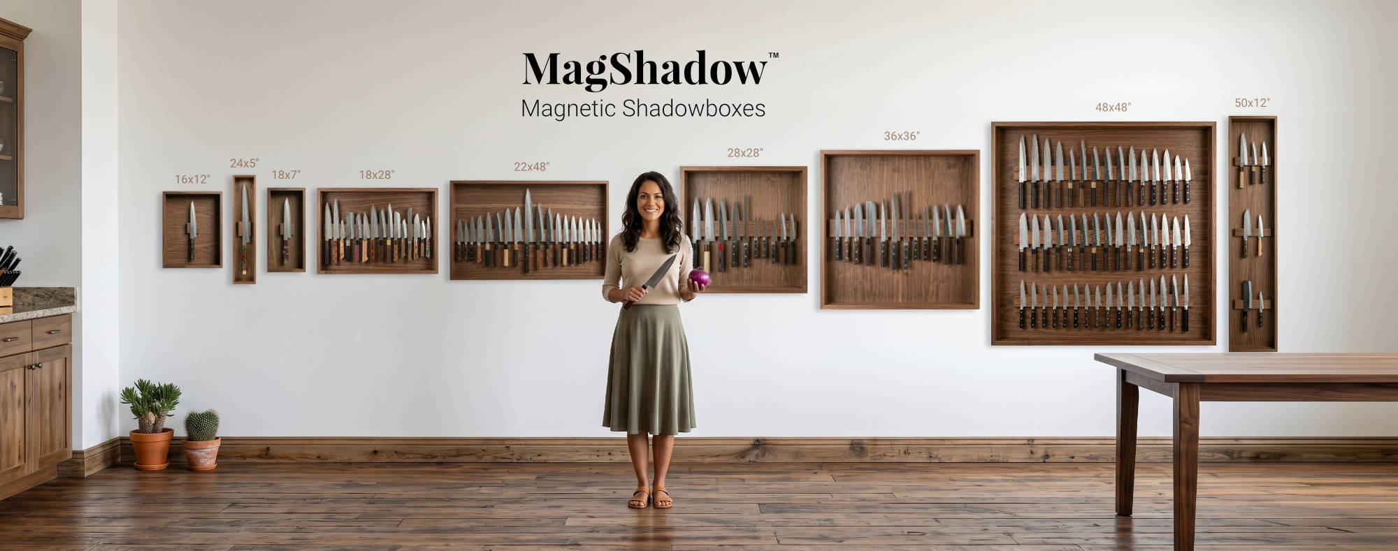 Whether you have a collection of your favorite knives, a single prized display piece, or a unique artifact, the MagShadow™ comes in sizes ranging from 18×7″ all the way up to 48×48″.
