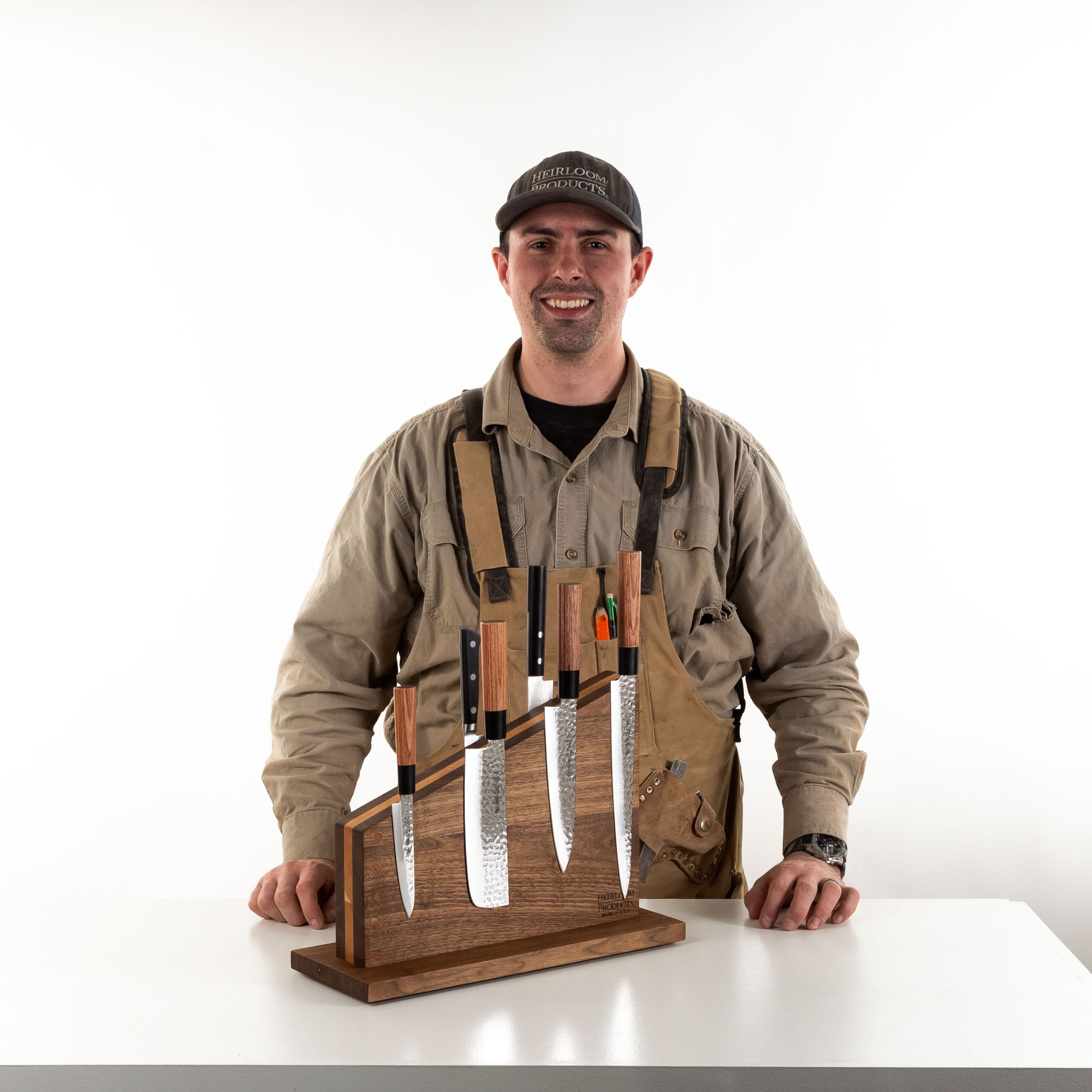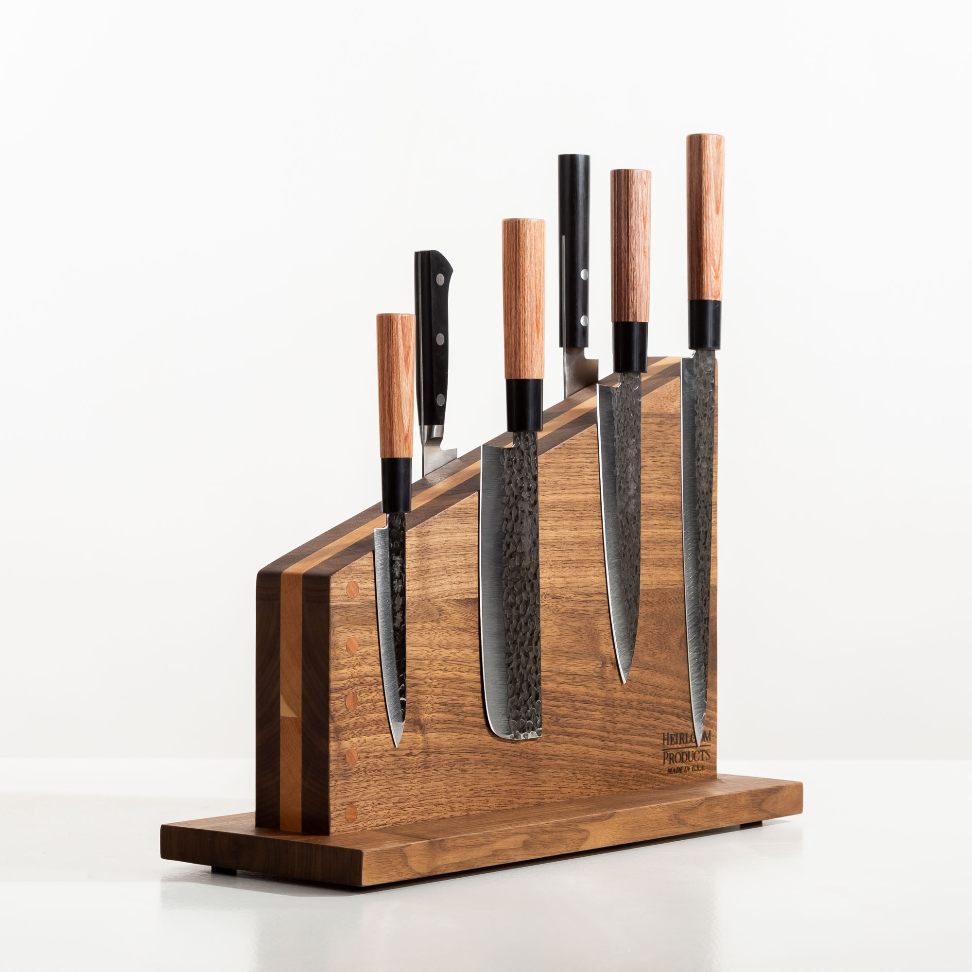 Unlike mass-produced countertop knife holders, our countertop knife holder is a true work of art. Each piece is handcrafted in the USA using authentic lumber construction to create a durable, eye-catching design. The result? A knife holder that is functional and a stunning centerpiece in your kitchen. No cheap veneers or imitation wood—just solid, beautifully crafted hardwood built to last.