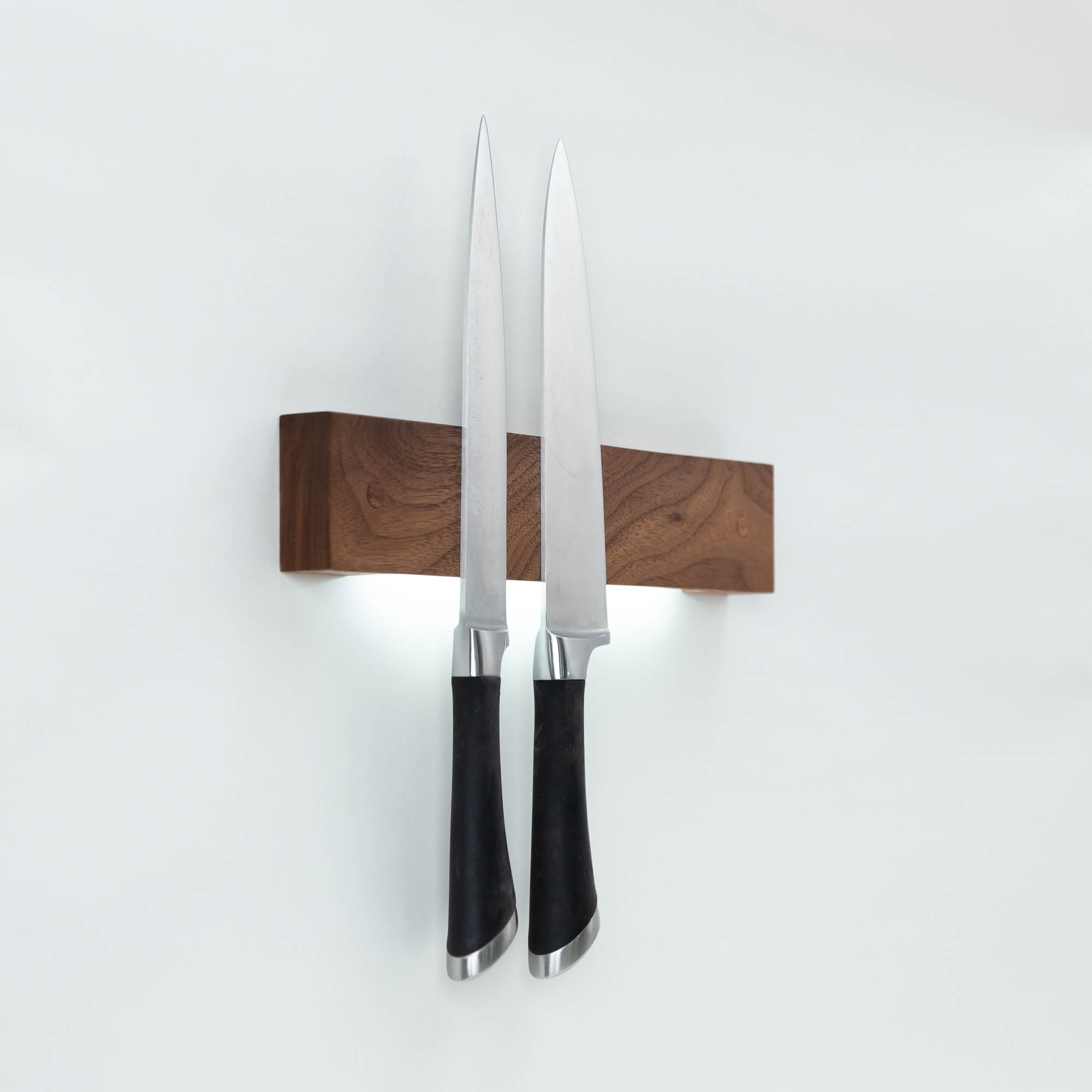 Made in the USA with solid Black Walnut.  Mounting holes are beautifully finished with wooden plugs, adding a touch of charm to the face of the backlit knife holder.