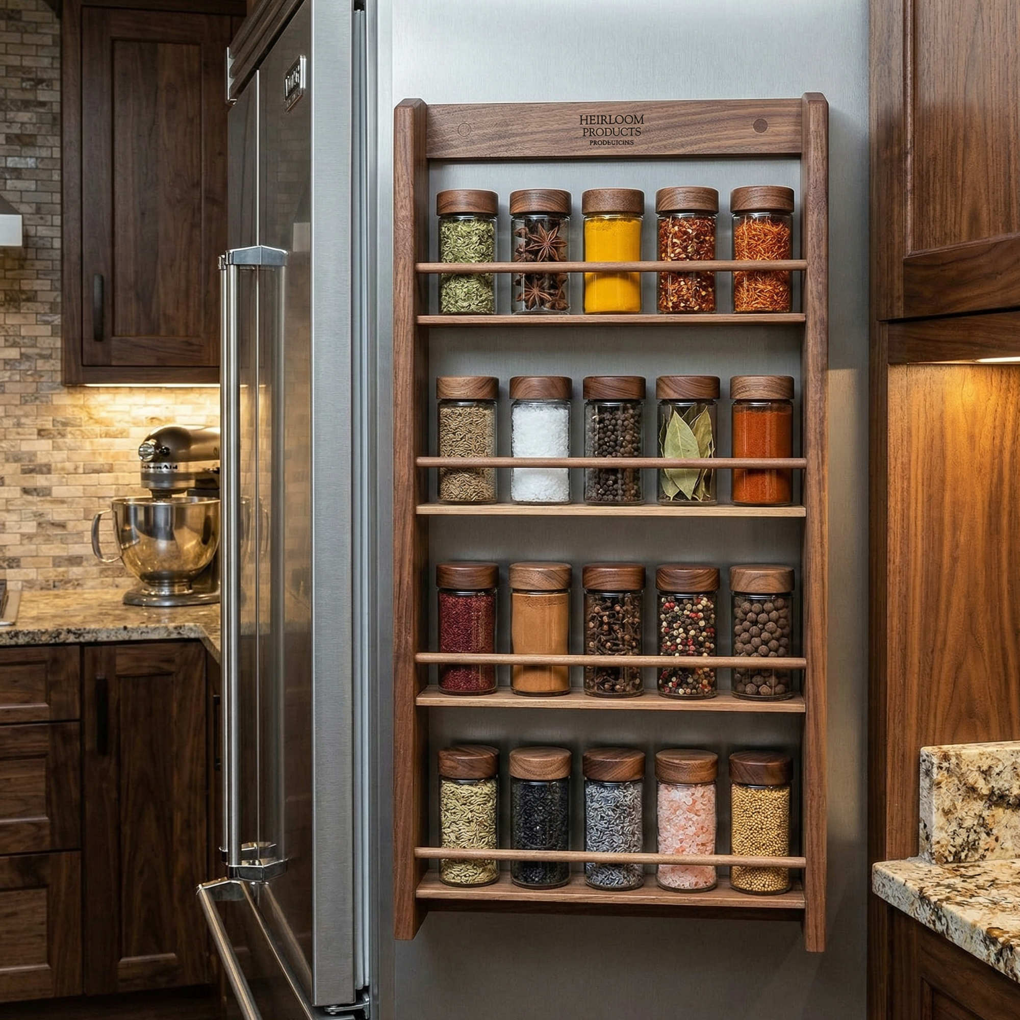 Every Heirloom spice rack is made 100% in the USA with solid wood. These unique, high-quality spice storage racks are not only naturally beautiful but also very functional. Each shelf holds numerous bottles (not included) and can fit bottles up to 2 1/8″ in diameter on the Standard depth version and up to 3 1/8″ in diameter on our Deluxe depth version.